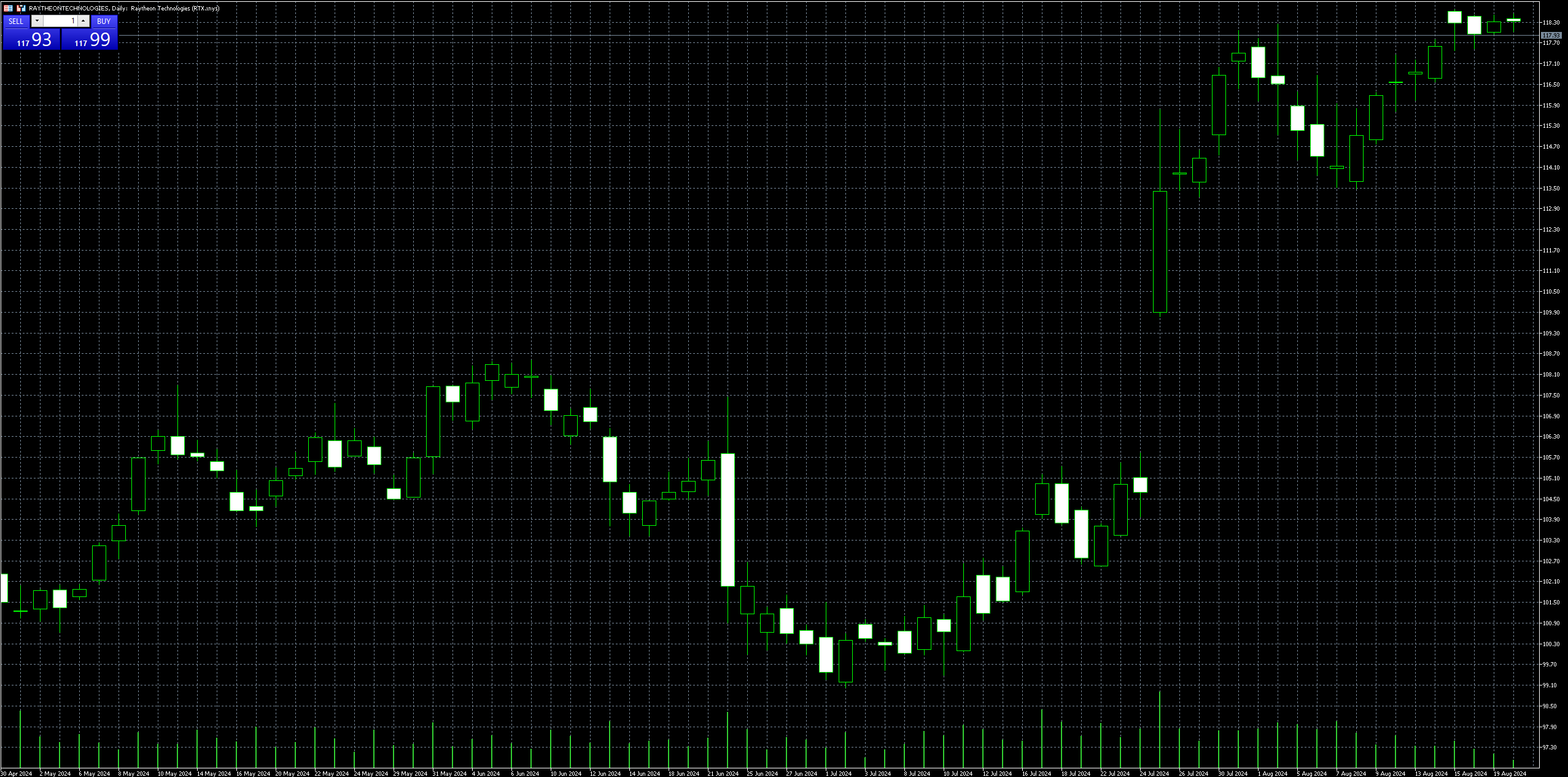 Whether you trade using MT4 or MT5, entering buy and sell orders is similar. Assuming research suggests RTX is oversold or overbought, you can buy and sell the stock through MT5’s order window (F9).