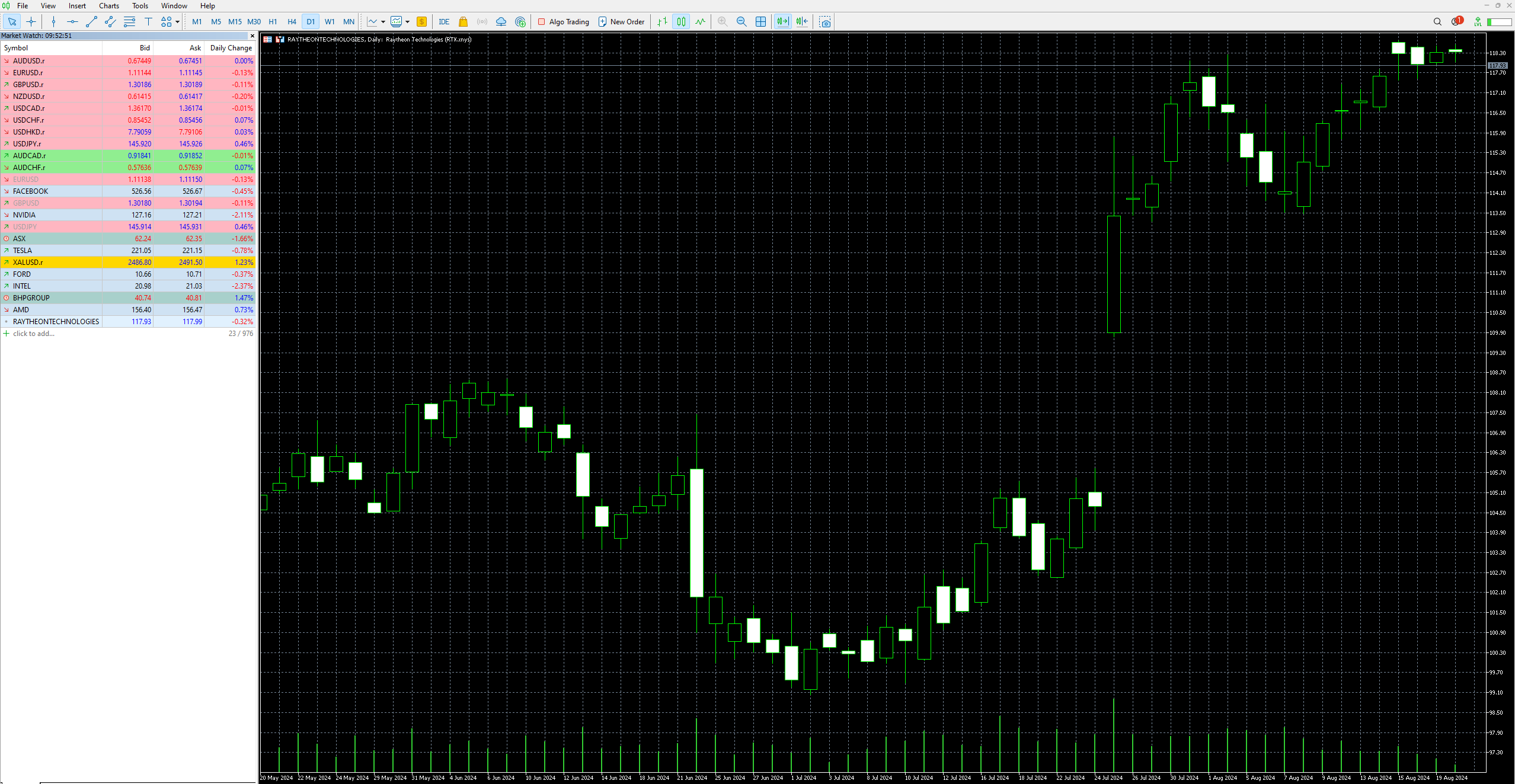 With the stock now positioned in your Market Watch tab, drag and drop it to the primary chart interface on the right, creating a live, real-time chart for RTX. Traders can now alter their chart preferences, from background colours to chart types, timeframes, technical indicators, and drawing tools.