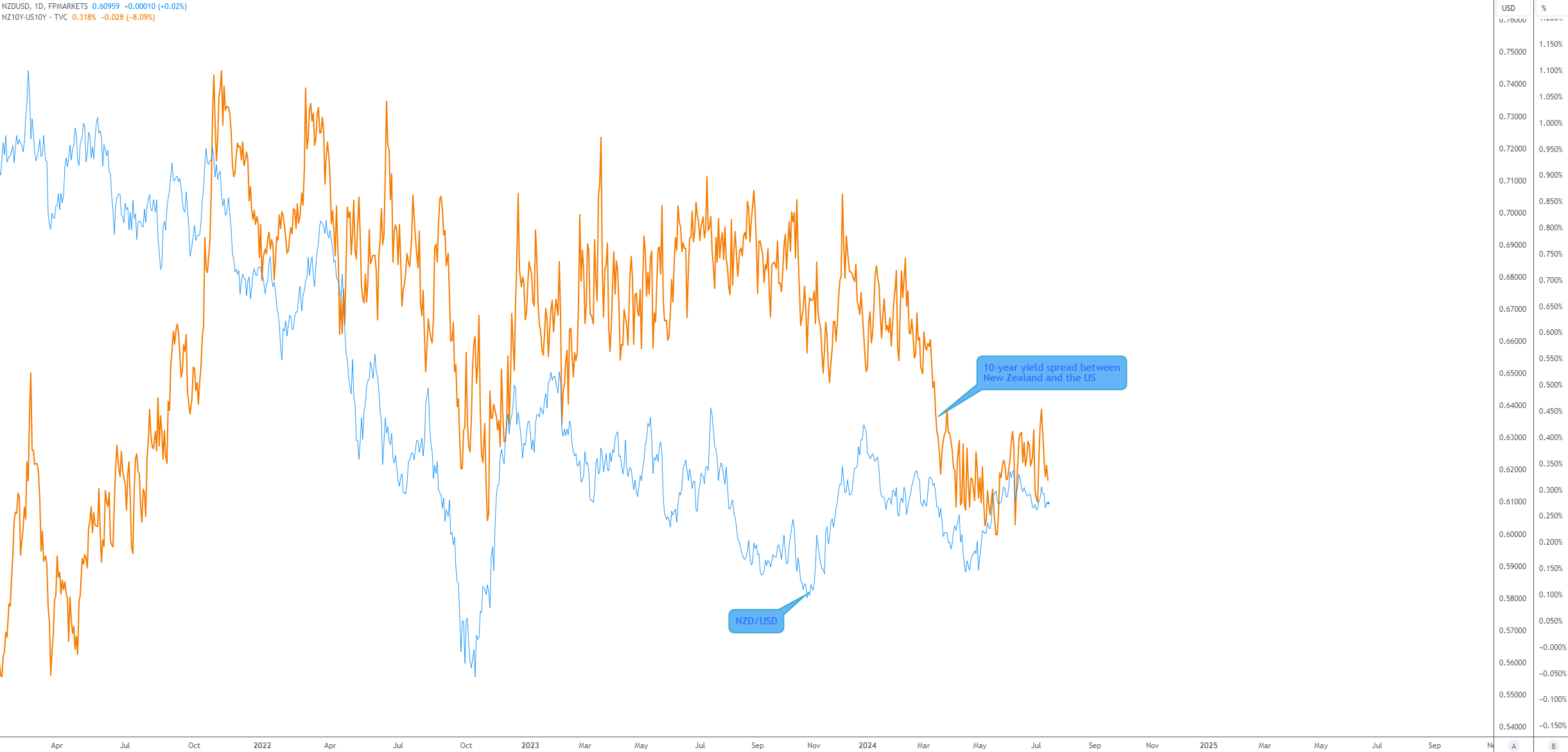 You will then see the yield differential between the 10-year yield of New Zealand and the 10-year yield of the US applied over the price chart. If the yield spread is unaligned with the chart, click on the + symbol once more and ensure that the yield differential is set to a new price scale.
