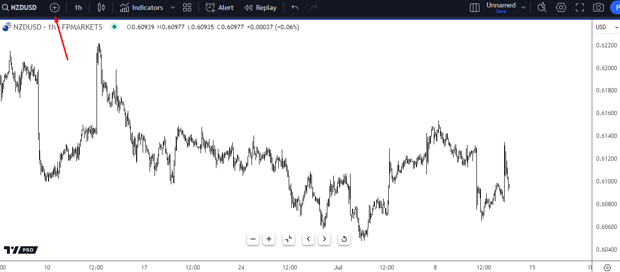 As an example, suppose you want to view the difference between the 10-year yield for New Zealand and the 10-year yield for the US, first open the NZD/USD H1 chart (you can open the chart in any timeframe; the bond yield spread will be the same), as below: