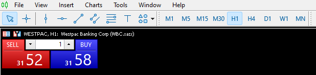 To find the Westpac ticker (WBC) on MT5, open your Market Watch tab (Ctrl+M), which lists all the active bid and ask quotes offered at FP Markets. Type ‘WBC’ in the ‘click to add’ feature at the bottom of your Market Watch; this will then display the Westpac stock. Following this, click on the stock, which will then be added to the Market Watch. At this point, you are free to drag and drop the stock to the chart interface and alter the chart’s preferences to suit your trading style.