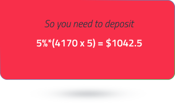 Your analysis suggests that the price of the US30 will rise, so you decide to buy 5 contracts and your margin rate is 5% (1:20 Leverage). This means that you need to deposit 5% of the total position value into your trading account.