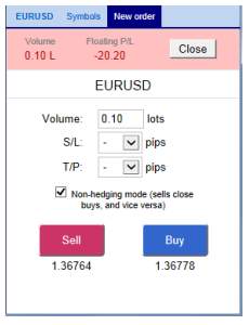 The top of the trading form shows any open position in the selected symbol, with a button for closing the position. Below that is a simple form for placing a new buy or sell market order.