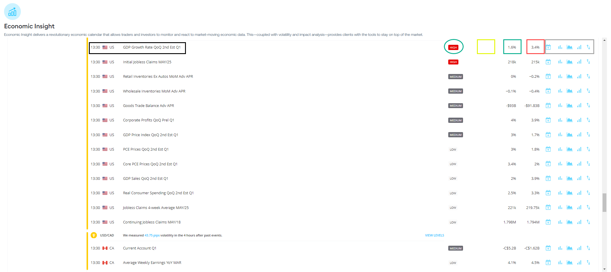 The Actual value and the Forecast value are the two primary data points traders must understand on the economic calendar. A deviation in these two figures is behind some of the fiercest moves in exchange rates. For example, Figure 1 shows that the US GDP (Gross Domestic Product) for Q1 2024 will be released at 1:30 pm and the Forecast is 1.6%. With economists expecting this event to be 1.6%, any notable deviation, say 1.3% to the downside (usually referred to as a ‘miss’) or 2.0% to the upside (a ‘beat’), could have an immediate effect on the US dollar.